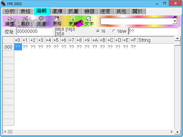 1、在搜索栏里打“?”搜索后就可以启动模糊搜索,这时候进入游戏让要修改的数值产生一点变化比如费点血什么的,回到FPE在搜索栏里打减号(费血了嘛),搜索以后就可以缩小范围,这样一步一步地重复下去就可以定位了。