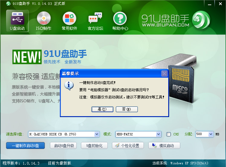 2、安装完成后,弹出91U盘助手制作界面,插入你的U盘,点击一键制作。【插入U盘之后点击“一键制作USB启动盘”按钮,程序会提示是否继续,确认所选U盘无重要数据后开始制作:(在制作的过程中请不要进行其他操作,避免U盘启动盘制作失败,制作过程中请耐心等待,当提示制作完成时即完成启动U盘的制作。)】