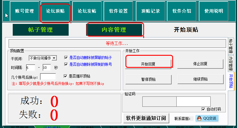 2、之后选择“论坛顶贴”,选择“内容管理”,输入需要内容,就能进行【开始回复】