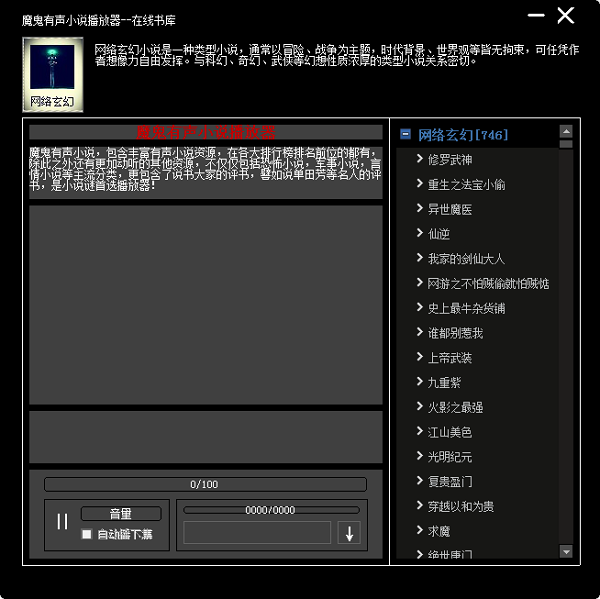魔鬼有声小说播放器,包含有丰富的有声小说和评书资源,可在线收听和下载有声资源,软件还具有定时关机的功能。