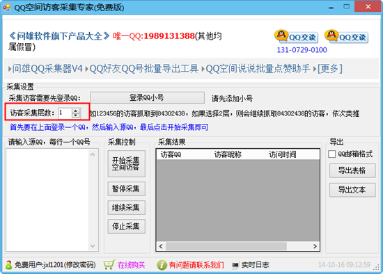 问雄QQ空间访客采集专家是一款可以批量采集QQ空间访客的工具,只需要您输入一个或多个源QQ,便可以一键采集访问过该QQ空间的访客信息(访客QQ、访客昵称、访问时间),支持多层采集!此功能用于采集抓取精准的QQ客户,可以采集竞争对手空间的访客,便于营销!