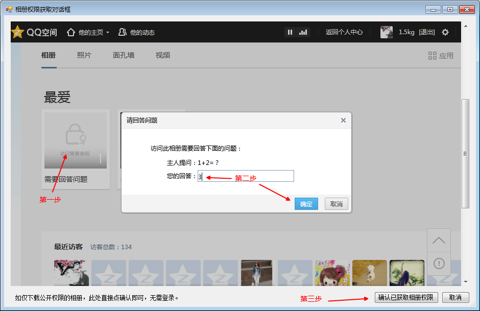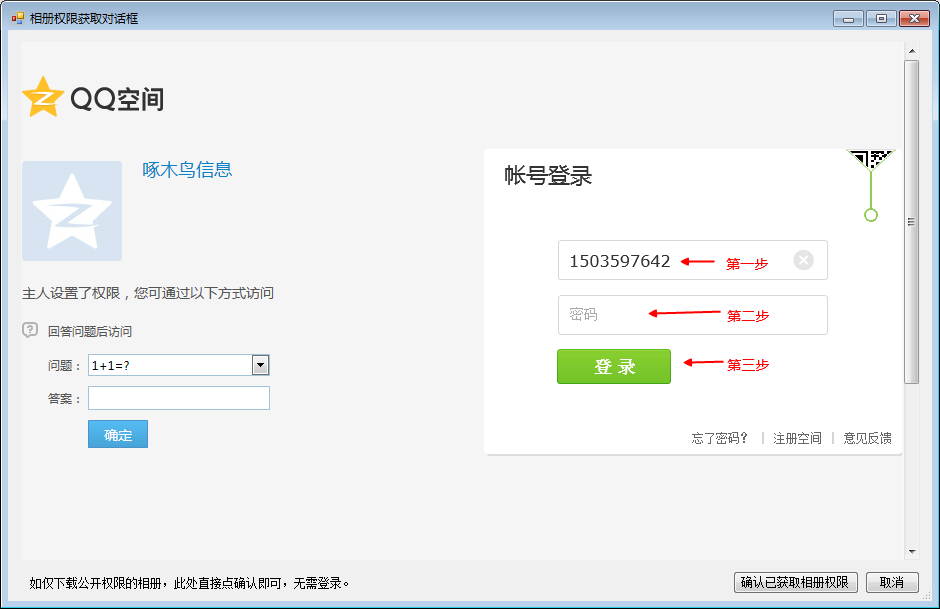 2、随后软件会根据您输入的QQ号判断是否需要登录。公开权限的空间不需要登录,直接就可以打开。设置了好友或回答问题的空间则需要登录您自己的QQ,以确认您有访问主人相册的权限。如下图: