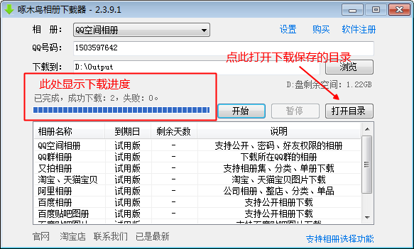 1、打开软件,【相册】选择“QQ空间相册”,【QQ号码】处输入您要下载的QQ号,然后点【获取相册】按钮。如下图: