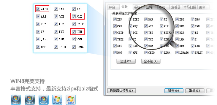 国内独家完美支持包括Win8、Win7、Vista、WinXP和Win2003在内的所有WINDOWS系统,并且比传统压缩软件支持更多的压缩格式。只需安装一款软件,即可轻松解压超过50种常见压缩格式。最新完美支持ZIPX和ALZ格式解压,能够压缩LZH格式。