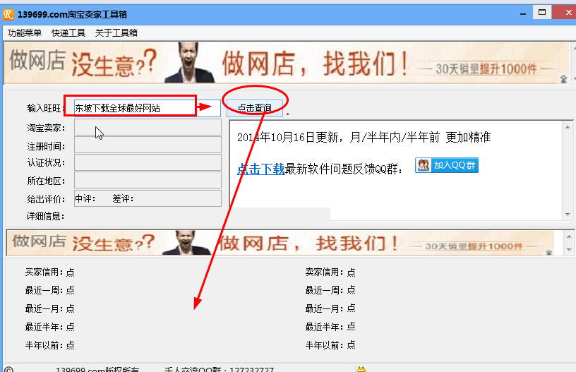 139699淘宝卖家工具箱是款专门来查询淘宝卖家信息软件,只需要输入旺旺,就能查询大量的包括信用、办证情况,让大家非常能直观的查看,而且这样的软件不需要进行安装和付费!