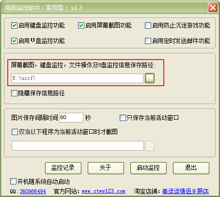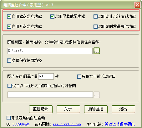 创天无忧电脑监控软件(家用型) 是一款绿色小巧的电脑监控工具,主要对电脑的使用情况进程监控,用键盘监控,屏幕监控配合使用,可准确的了解在您不在的情况下,电脑的使用情况,包括QQ聊天,MSN监控等等;用U盘监控,主要针对小孩进行量身定制,限制小孩无限制使用电脑;邮件发送功能,可使你不在电脑旁就可以得到您的电脑使用信息。