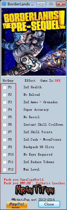无主之地前传十二项修改器是玩家为无主之地制作的一款修改器,内含12项功能,包含无限生命、无限子弹、无限金钱等功能,分分钟变强大有木有?