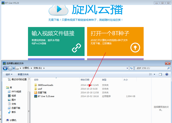 4、点击打开BT种子会弹出选择文件对话框,经测试,基本上90%以上BT文件都可以直接播放。