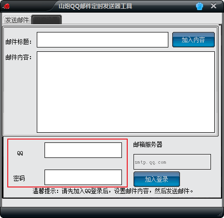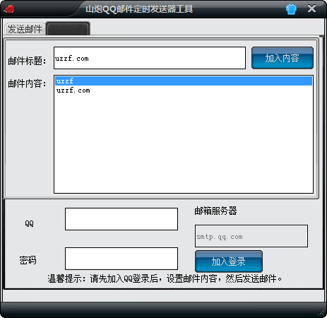 山炮QQ邮件定时发送器工具(QQ邮件定时发送软件)是一款绿色免费的由网友山炮制作的QQ邮件定时发送软件。软件功能强大,支持多帐号导入,支持批量邮件发送,无需安装;界面简约大方;无需学习,一看就会;体积小,只有1532KB;内存占用小,下载后便可以定时给朋友送生日祝福邮件。