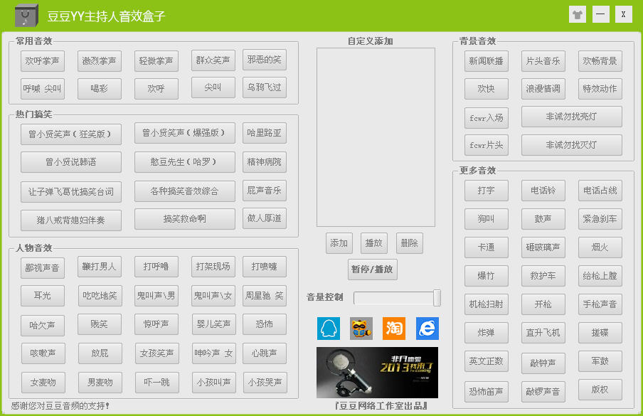 豆豆YY主持人音效盒子是一款网络K歌、网络主持、MC喊麦、演出活动必备的音效辅助工具,能有效的带动现场活动气氛,使录制的作品更加生动有趣。丰富效果库(常用的掌声、笑声、喝彩、尖叫、网络热门搞笑语音、人物音效、背景音效、动物音效、武器音效、DJ音效等等),清晰的分类,播放/暂停、音量控制功能,增加自定义添加音效功能,自带4套精美Metro风格皮肤。