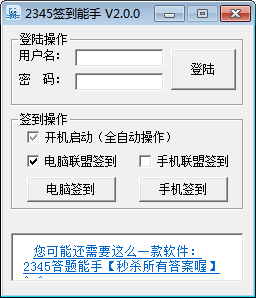 2345签到能手是一款专门用于2345技术员联盟推广员每日签到的工具,使用这款工具再也不用担心漏签了,喜欢的网友快来下载吧!