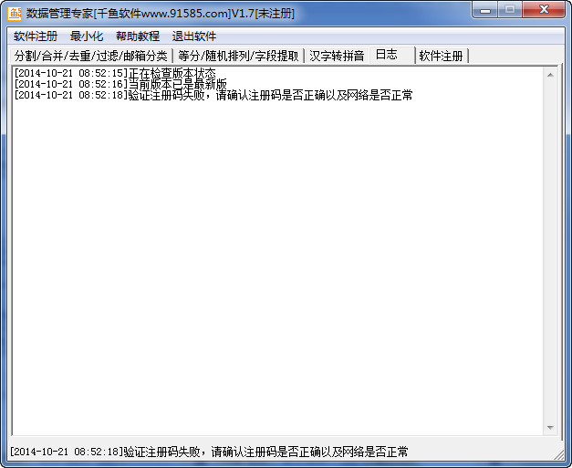 分割:将数量巨大的列表文件,如:旺旺列表,邮箱列表等,快速分割成多个文件,每个文件包含相同条数的记录;合并:将多个列表文件合并成单个文件,并对重复的记录进行去重处理,只保留一个;去重:将单个列表文件中重复的记录去掉;过滤:去掉A文件中在B文件中有的记录;邮箱分拣:对不同类型邮箱地址列表按邮箱类型进行分类,每个类型的邮箱地址保存为一个文件。处理速度非常非常的高速,,几百万个数据处理只需几秒钟。
