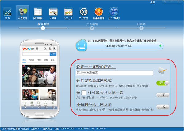 软件安装后,请参考“花生米广告(即上网认证)设置.pdf”对顾客上网认证方式进行设置。