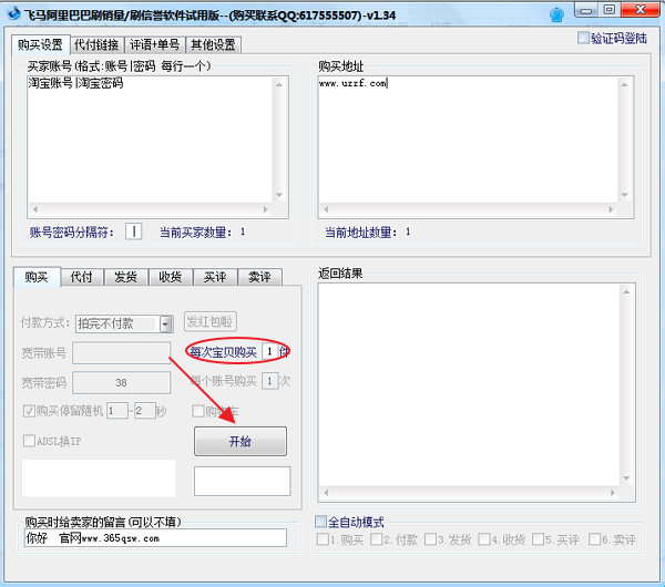 3、输入宝贝购买数量,点击【开始】
