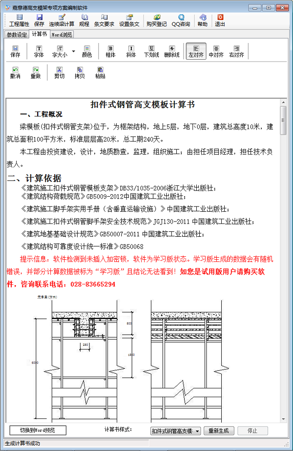 1、根据输入工程参数,一键生成高支模架及超大梁专项方案计算书。