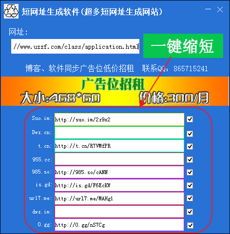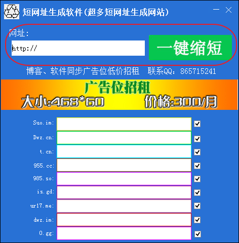 短网址生成软件(网址缩短工具)是一款绿色免费的由苏苏博客制作的支持超多短网址网站的网址缩短工具。软件功能强大,提供了多个网址缩短接口,更方便了大家的选择。方便你转帖到论坛或者微博等。