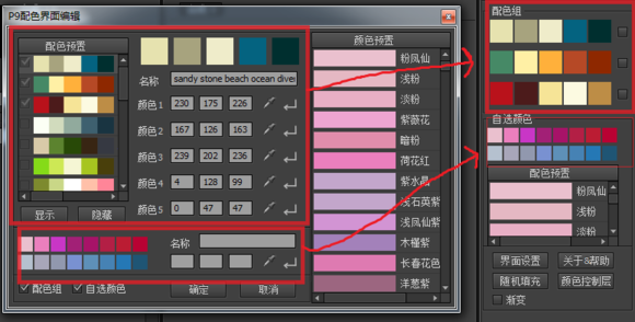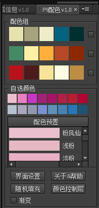 P9color是一款可以帮助对调色非常不敏感的人的一款AE脚本,软件简单好用,功能强大,可以快速添加颜色,填充颜色,储存个人用色信息。内置了十几款最有人气的配色,来自于Adobe的配色网站,同时脚本支持储存自己的配色方案,可以储存好后以备后用。