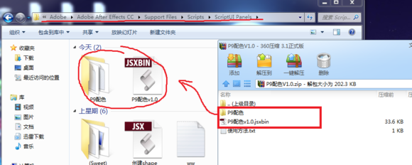 把以上的jsxbin文件和文件夹放入AE所在文件夹下的Support Files\Scripts\ScriptUI Panels文件夹里面