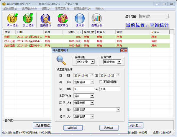 3、查询统计,可采用多种方法,准确定位到目标信息并进行相应的统计,使任何时间 段内的收入、支出、余额等情况一目了然。