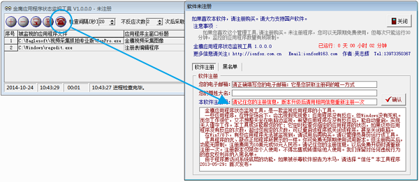 一些应用程序,在特定场合下,会出现假死现象:应用程序没有反应,但Windows没有死机。而您工作很忙,又不想整天坐在电脑边监视,希望应用程序在没有反应后,能自动重启,实现无人值守工作。本工具或许能帮您的忙:它定时检查你指定的应用程序的状态,如果这些应用程序没有反应的次数,超过您规定的次数,可以重启该程序或关闭该程序,甚至关闭电脑。