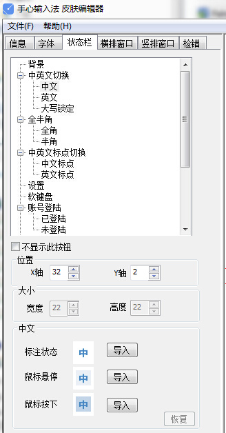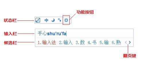 手心输入法皮肤主要分为三大部分:状态栏、输入栏、候选栏。其中状态栏上显示各功能按钮,每一个按钮可以有三种状态(标准状态、鼠标悬停、鼠标按下),输入栏上显示输入的拼音串和部分选中时的候选内容,候选栏上显示要输出的内容。