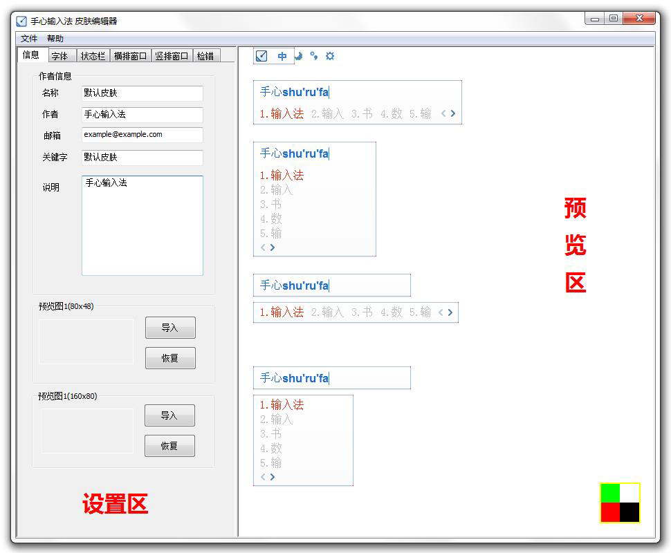 1、打开皮肤编辑器,首先看到的是“信息”界面,您需要在皮肤信息中填写相关信息,皮肤名称、作者、邮箱信息是必须填写的。另外您导入的“预览图1”会显示在输入法主程序的设置向导面板上,建议导入图片尺寸为“96x72”,“预览图2”显示在皮肤管理面板上,建议导入图片尺寸为“176x92”。