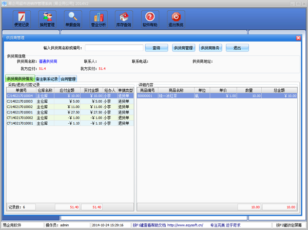 进货管理:进行商品采购入库,采购退货,进/退单据和当前库存查询,与供货商的往来帐务。