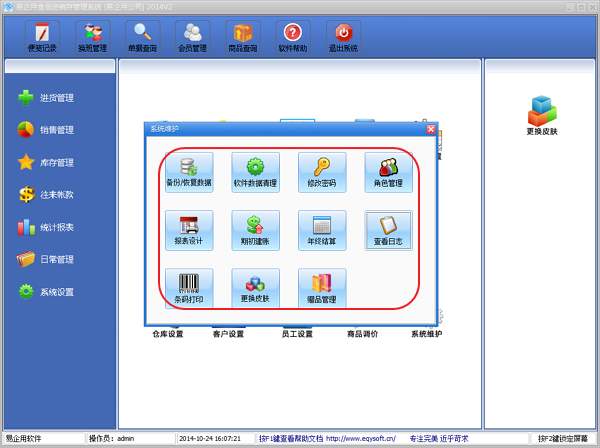 系统维护:可以对数据库备份/恢复,系统初始化,操作员修改密码,年终结算,查看日志。