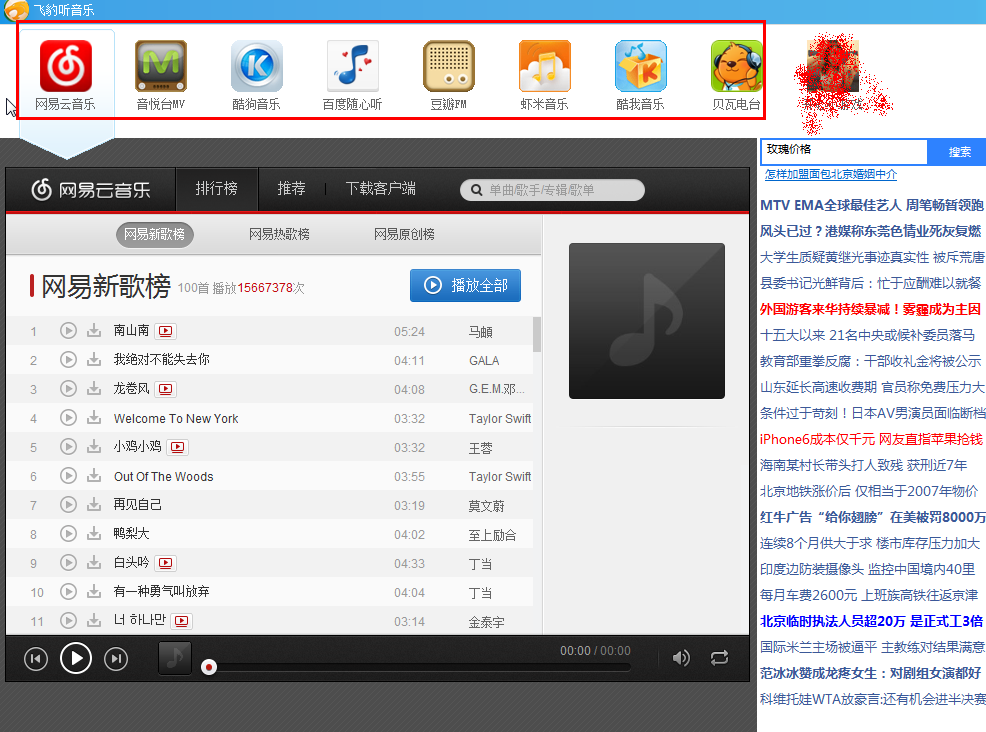 飞豹听音乐是款整合的现在网络最常用的音乐播放器软件大全,不但在这个里面就能听到任何播放器里面的音乐,而且音质保证也是不会差的,更重要的是在听音乐的过程中也能浏览最新资讯,让你能够做到身体尽量放松的状态!