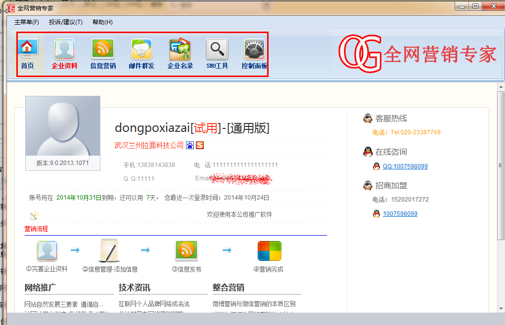 全网营销专家是款功能非常强大的营销软件,它不但能支持各类网站的定时发布各类推广信息,更具备自动搜集各类企业的相关信息的功能,而且软件联网就会自动更新版本,不需要你进行手动升级,关键操作也不复杂,适合大家来下载使用!