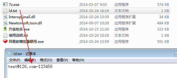 1、首先将邮箱账号保存到ID.txt文件里,格式为:ID-密码,如:test@126.com-123456