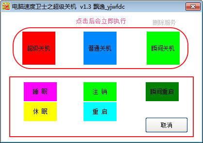 电脑速度卫士之超级关机(电脑自动关机工具)是一款绿色免费的由网友飘逸制作的电脑关机辅助工具。软件功能强大,支持三种关机模式,还支持休眠、睡眠、注销、重启、瞬间注销等操作。
