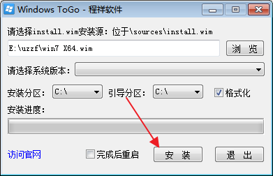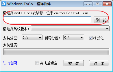 2、打开Windows ToGo,选择镜像文件位置,并选择安装分区、引导分区