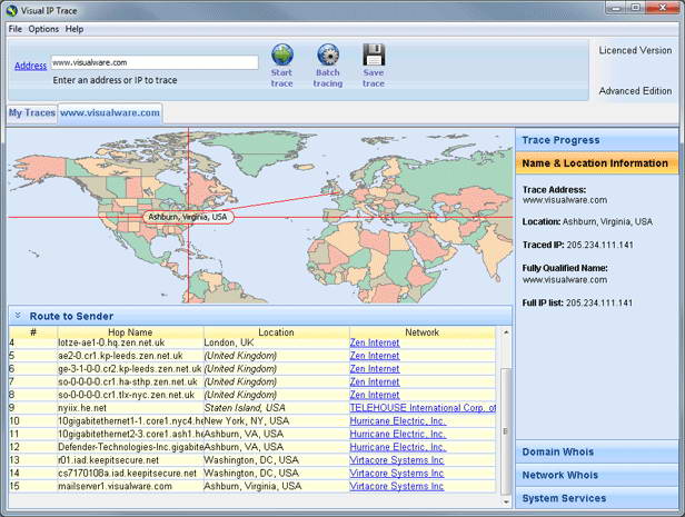 Visual IP Trace识别电脑黑客,验证网站和调查 IP 地址,踪迹分析报告提供详尽的信息,包括被估计网站的物理地址点,网络提供者和世界范围的 whois 信息。分析报告使得用户在递交保密的信息之前,踪迹证实一个网址一个电脑黑客或者嫌可疑的站点,报告互联网络滥用或者违法活动