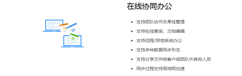 团队始终保持同步,多人处理同一份文档,自动保持最新不受地域限制,几乎可从任何位置共同处理文档可根据团队分工不同,设置多级权限进行文件夹共享消息通知网盘同步、更新及共享动态,使每个人都知情