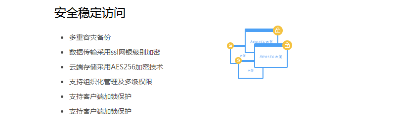 高速的传输:全国多数据中心,数据传输高速稳定,上传下载速度峰值可达M级/s安全的存储: AES-256银行级加密存储,Http+SSL协议安全传输数据稳定的运营:国际领先的防火墙和杀毒标准,完善的数据备份和容灾机制放心的使用:日志查询、误删恢复