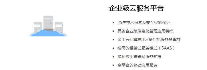 金山企业云是金山云推出的一款云存储服务。依托于金山软件多年的深厚技术积累,以及25年安全积累,为广大企业用户推出的集存储、备份、同步、共享为一体的云办公平台。金山企业云致力于为企业网盘用户提供体验一流和极度安全的数据共享服务,有效解决传统企业办公中文件存储分散、文件安全性低、文件管理混乱等难题,全面开启云办公时代。