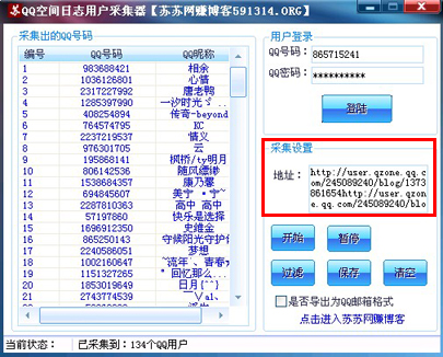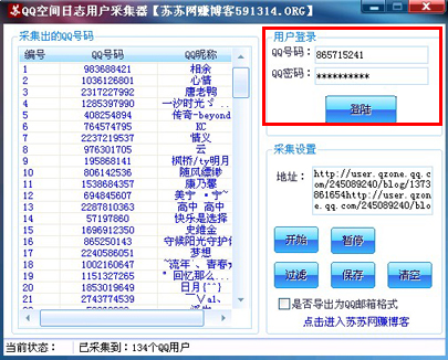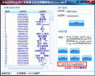 QQ空间日志用户采集器是一个绿色免费的QQ空间访客采集器,主要是采集QQ空间日志的访客。主要思路就是把QQ空间日志里精准的用户采集下来,便于针对特定用户进行精准的QQ营销。采集的用户可以导出为QQ邮箱格式。