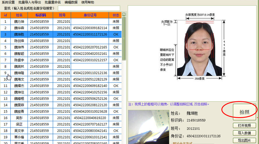 选择像片规格—单击预览按钮启动摄像头,显示视频图像,—单击照相按钮照相,软件自动跳到下一个,并自动保存相片。照片保存成功在照否一栏显示“ok”。如果中间某学生缺照(不在现场)需要跳过往下照相,点击下一个学生继续照相;缺照学生回来后要照相。