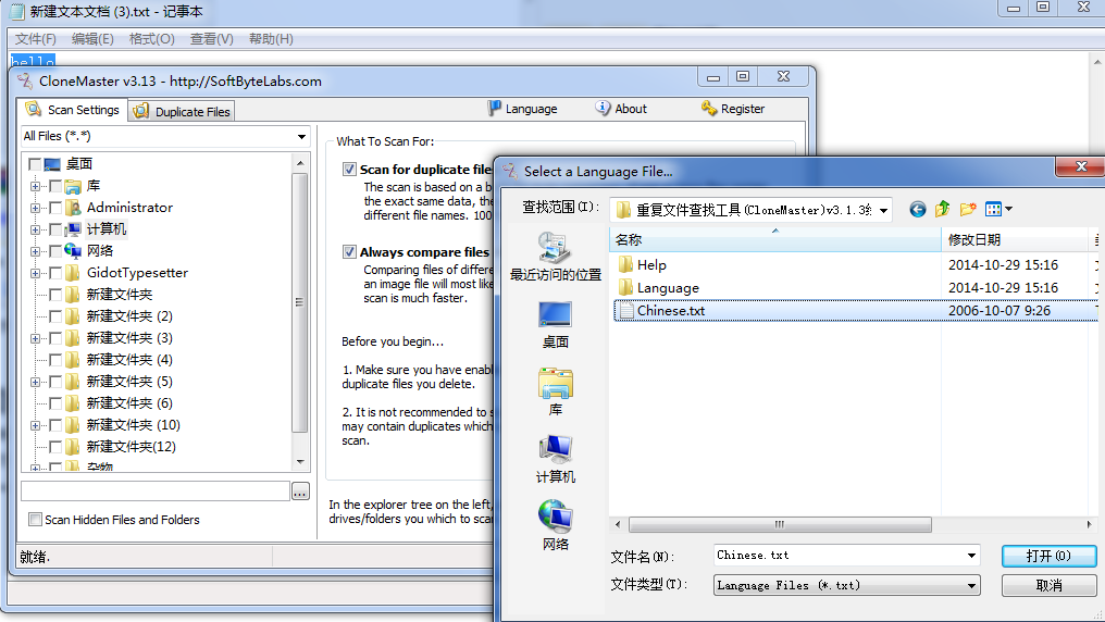 有时候系统中的文件有太多重复文件怎么办,CloneMaster是一个重复文件查找工具。能找出硬盘上真正重复的文件,空文件,重名文件,提出警告。以便于释放硬盘空间。带有智能删除,重命名,另存为等功能。使用前执行"注册.BAt"变为中文界面,不执行是英文,可以自己选择语言文件.下面小编来给大家介绍一下重复文件查找工具(CloneMaster)有一些什么功能。