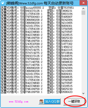 打开软件后点击【一键获取】,稍等一会就会显示可用的迅雷会员帐号和密码。