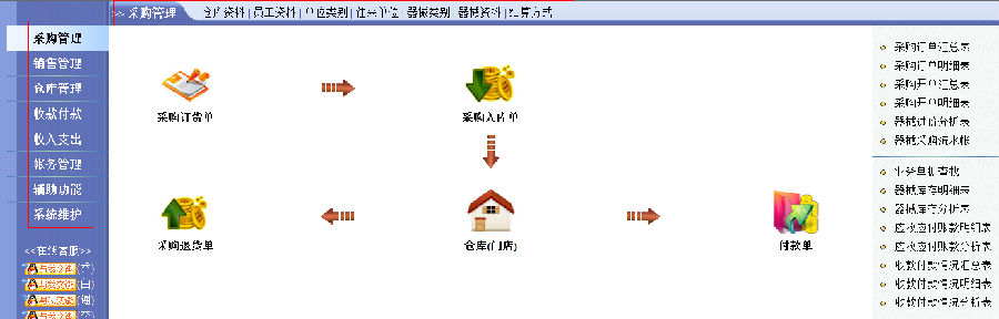 一、基本功能:智能订货、进货入库、进货退回、销售出库、销售退货、报损、报溢、调入、调出、拆零、组装、盘点、收款、付款、预收、预付、收入、支出、成本、利润及财务会计核算等。