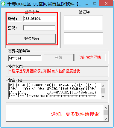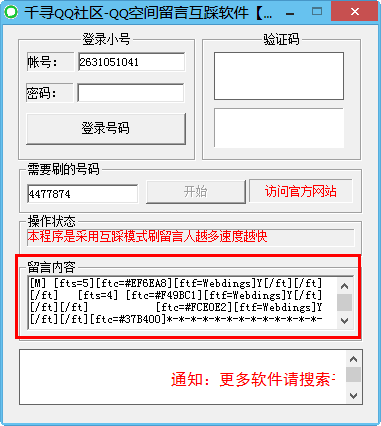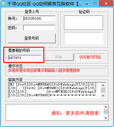 千寻QQ空间留言互踩软件是一个针对空间留言的自动刷人气工具,他可以让你的QQ空间快速增加人气。本软件主要是互踩所以速度不是很快,想留言更多就多邀请朋友一起用,本软件可以挂机无需经常看守。