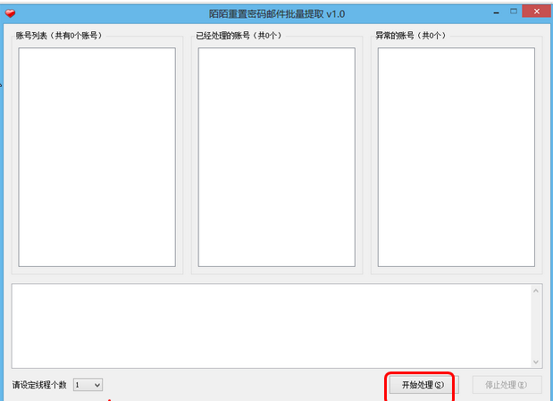 2、点击【开始处理】,软件会自动开始批量登录邮箱,并且寻找目标邮件,如果找到则进行处理。处理情况会实时显示到【已处理的账号】和【异常的账号】列表中。