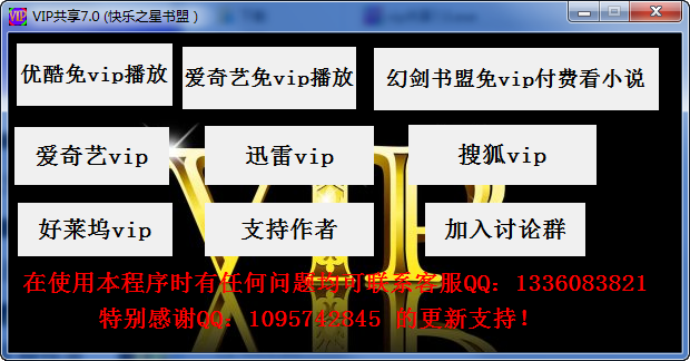 VIP共享是一个强大的VIP账号共享器,它目前能拥有共享爱奇艺的账号,优酷的VIP视频解析两大功能,迅雷和搜狐的VIP还在完善中,有了这个vip共享器,让你轻松看片。