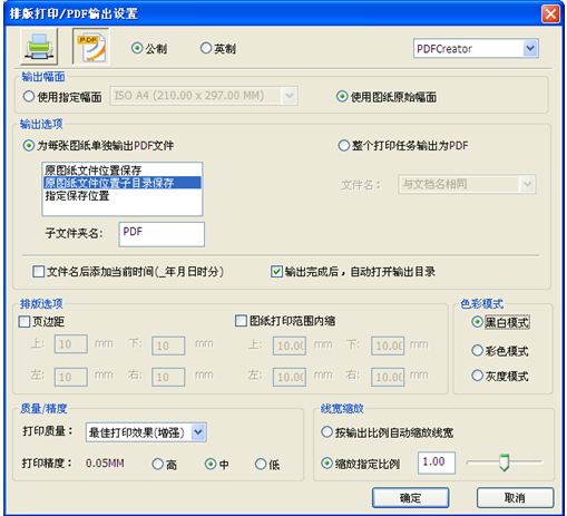 5)更改PDF输出在设置为指定幅面时,CAD文件中的图框与指定纸张幅面一样或超过指定幅面时,可以自动缩小至布满指定幅面;而CAD文件中的图框比指定纸张幅面小时,则自动裁减纸张,让纸张与原图一样。比如指定A2幅面的纸张,则CAD文件中的图框是A2、A1等时,自动缩小到A2纸张大小;如果CAD文件的图框是A3、A4等时,输出PDF时仍然是A3、A4的大小。