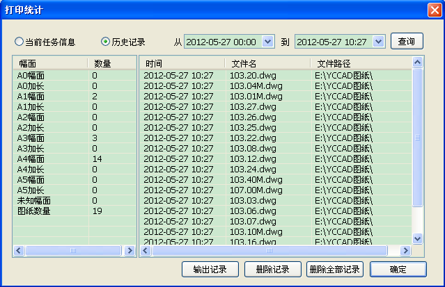 8.打印统计在CAD批量打印功能下,统计功能可以记录批量打印的时间,图纸的幅面和数量,并可以对当前的打印任务和历史的打印记录作出统计,减少管理人员不必要的麻烦。
