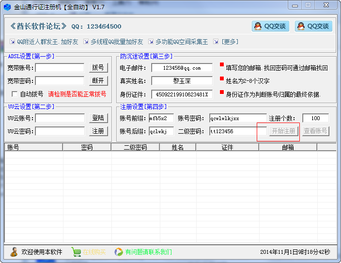 3..账号前缀和后缀.例子:tttt0001zzzz前缀是“tttt后缀是“zzzz中间的0001则是根据要注册的个数生成.要注册100个的话,则从【tttt0001zzzz】到【tttt0100zzzz】如果中间的【tttt0005zzzz】被注册过.数字将会超过要注册的100.一直到注册满100个为止