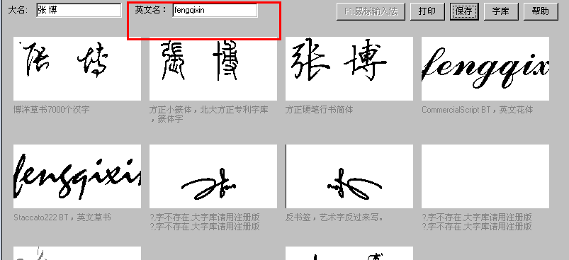 第二步:除了中文以外,还有英文的名的艺术签名,如下图。