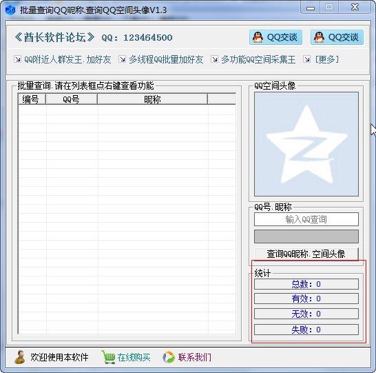酋长批量查询QQ昵称QQ空间头像工具是一款免费实用的QQ昵称QQ空间头像批量查询软件,使用者通过本工具能够一次检测100个号码,是QQ爱好者的一款必备神器,感兴趣的可以下载试试。